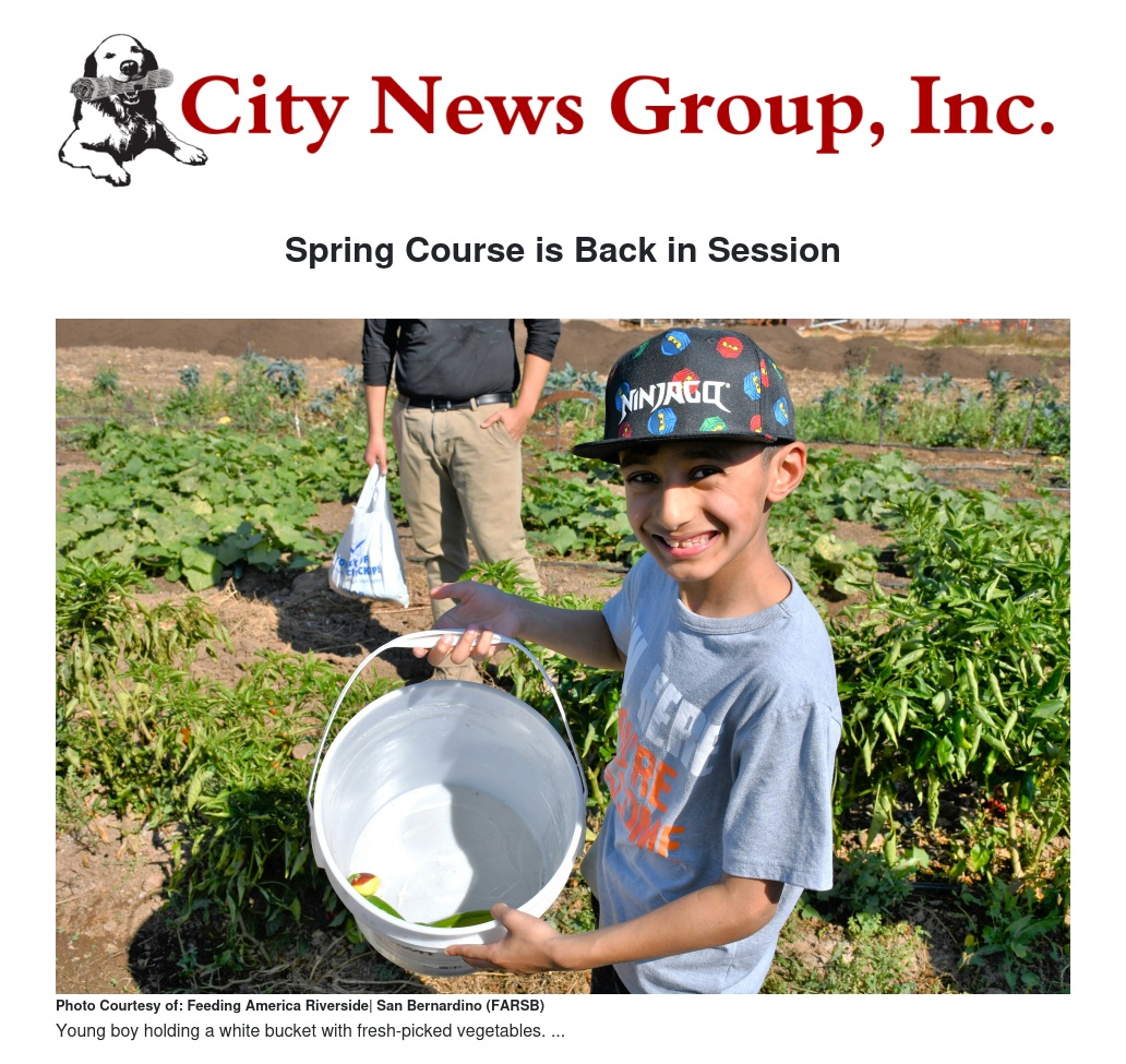Feeding America Riverside | San Bernardino (FARSB) invites parents and children to join the spring session of The Goodness in Food (TGIF) for a free 4-week interactive course designed for Grades 2-5 on health, nutrition, and sustainability. This program features two nutrition and food cycle sessions with FARSB staff, a presentation by a California Baptist University (CBU) guest speaker, and ends with a field trip to Overflow Farms to gain hands-on experience from a master farmer.