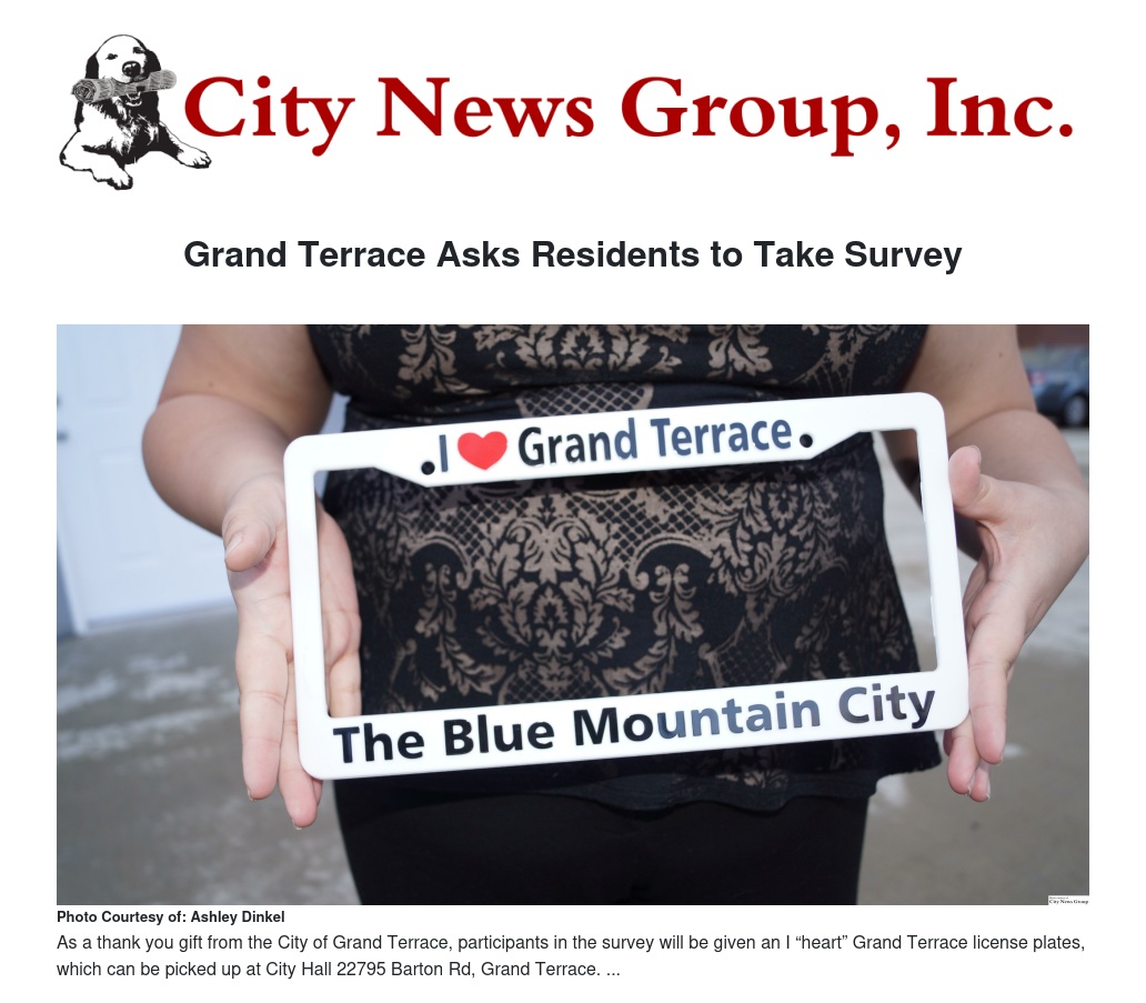 As a thank you gift from the City of Grand Terrace participants in the survey will be given an I “heart” Grand Terrace license plates, which can be picked up at City Hall 22795 Barton Rd, Grand Terrace.