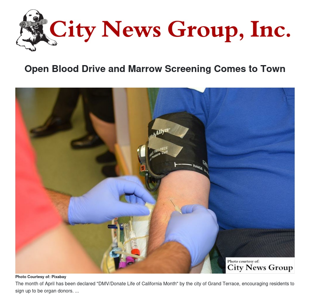 GRAND TERRACE>> The City of Grand Terrace will be having an open blood drive and marrow screening on Thursday, April 13 at 2069 Van Buren Street, Grand Terrace, Ca 92313.