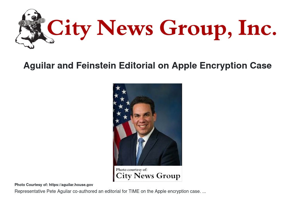 Rep. Pete Aguilar (D-San Bernardino) and United States Senator Dianne Feinstein (D-California) recently co-authored an editorial for TIME on the Apple encryption case. In the editorial, Rep. Aguilar and Senator Feinstein argue that Apple should help investigators preserve data on an iPhone left behind by one of the terrorists in the San Bernardino attack, which could potentially expose important information related to the investigation. They contend that refusing to comply with a court order in this particular investigation creates gaps in the United States’ national security. The editorial can be read in full below or at Time.com.