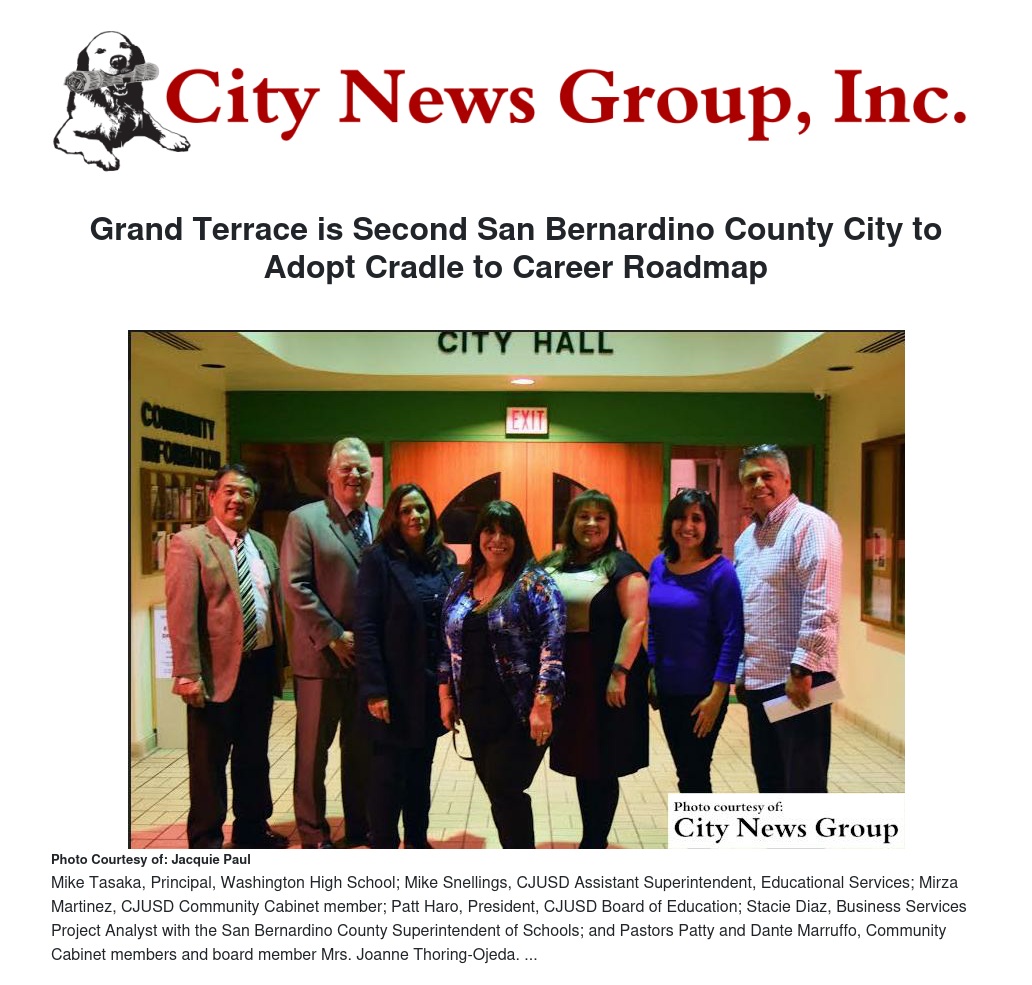 “I am so proud of the City of Grand Terrace for taking this important step in endorsing the Cradle to Career Roadmap,” Colton Joint Unified School District Superintendent Jerry Almendarez said. “This formal validation of our county’s educational mission sends a clear and positive message that our local leaders truly care about the future of their community and are willing to do what they can to support their youngest constituents.”