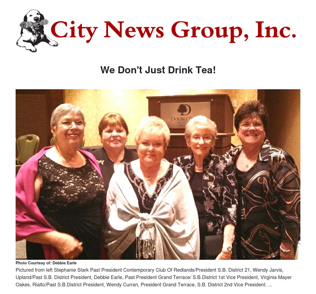 The Grand Terrace Woman's Club attended GFWC California Federation of Women's Clubs. The 111th Convention was held in San Jose, Ca. San Bernardino District 21 President Stephanie Stark from Redlands was installed. There are 14 Districts, and 263 clubs in the State of California. These ladies are still working for a better tomorrow.
