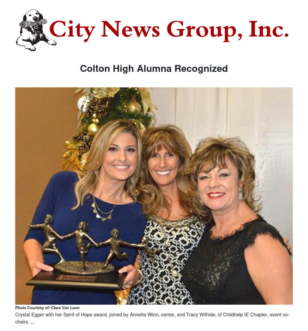 Crystal Egger, meteorologist for NBC4 Southern California, originally of Grand Terrace and a graduate of Colton High School, received the Spirit of Hope award last month for her service to children.