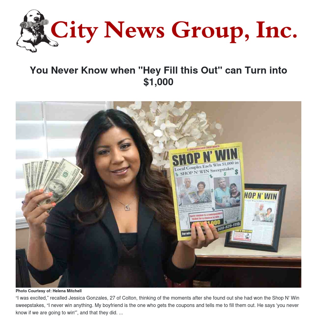 Jessica Gonzales, a life-long resident of Colton, was elated and surprised as Abe Sanchez, her boyfriend of 3 and a half years, told her she was the winner of the most recent Shop N’ Win monthly coupon book sweepstakes and would take home the $1,000 grand prize.