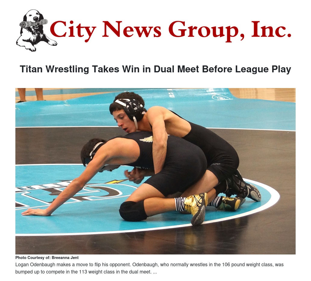 "Our lower weight classes did well and we had two key wins in [our upper weight] matches to put us on top," said Titan coach John Odenbaugh. "Our varsity kids are continuing to improve and (exhibit) a good level of competition for this time of the season, and we're looking forward to finishing strong."