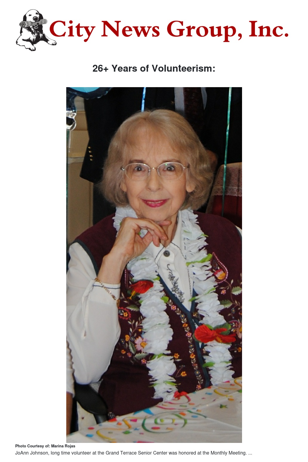On February 15, 2014, the Grand Terrace Senior Center (GTSC) held its regular monthly meeting but included a special twist. The front door was emblazoned with the greeting ‘Thank You for 26 Years of Service’ and everyone knew it was all in honor of past President JoAnn Johnson.