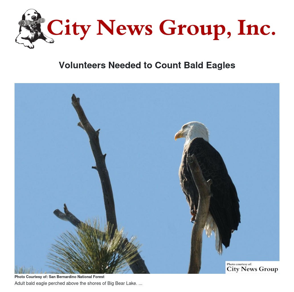 Volunteers are needed to help count bald eagles in the last wintering bald eagle count of the season in and near the San Bernardino and San Jacinto Mountains. Participants in February’s counts observed fourteen bald eagles.