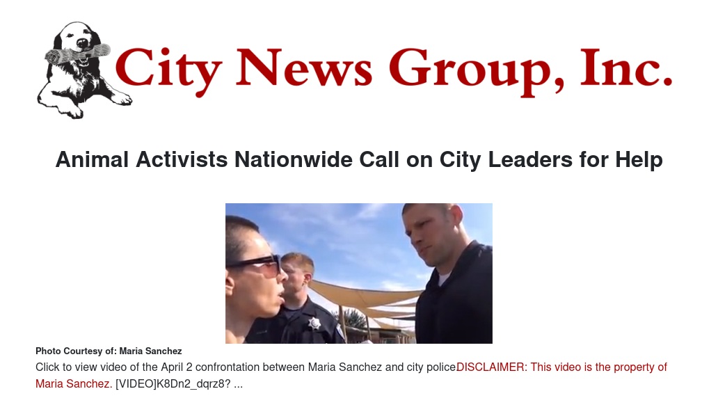The emails began after news of Sanchez’s April 2 arrest was published on a local news outlet website. (View videotape of the April 2 confrontation above.) Sanchez, who videotapes dogs and posts them to YouTube and Facebook in hopes to find them permanent homes, was arrested by San Bernardino City police on charges of trespass and assault on a peace officer. She spoke out against her arrest, which she called illegal, at the April 7 San Bernardino City Council meeting. (To read more about what happened at this meeting, visit http://sanbernardino.citynewsgroup.com/articles/3069cef69851a6be1506f406f42e064d.)
