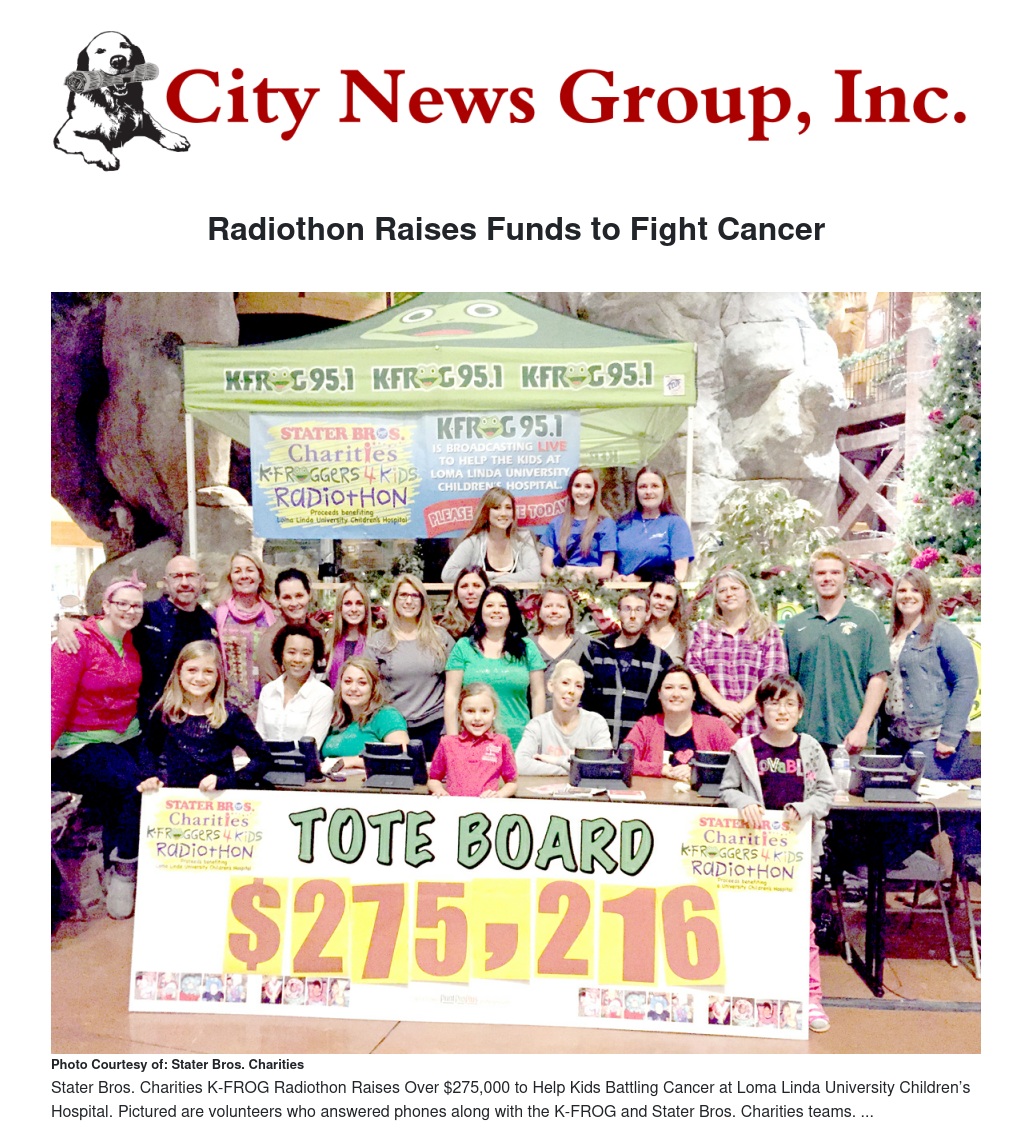 Stater Bros. Charities and K-FROG radio joined with Loma Linda University Children’s Hospital (LLUCH) for a radiothon on Dec. 3 and 4, running from 5 a.m. to 7 p.m. each day, which raised over $275,000 to support children battling cancer. The 13th Annual Stater Bros. Charities K-Froggers for Kids Radiothon was transmitted on K-FROG live from Bass Pro Shops in Rancho Cucamonga.