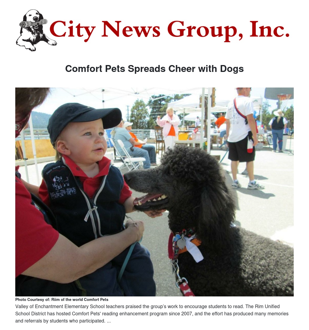Valley of Enchantment Elementary School teachers praised the group’s work to encourage students to read. The Rim Unified School District has hosted Comfort Pets' reading enhancement program since 2007, and the effort has produced many memories and referrals by students who participated.