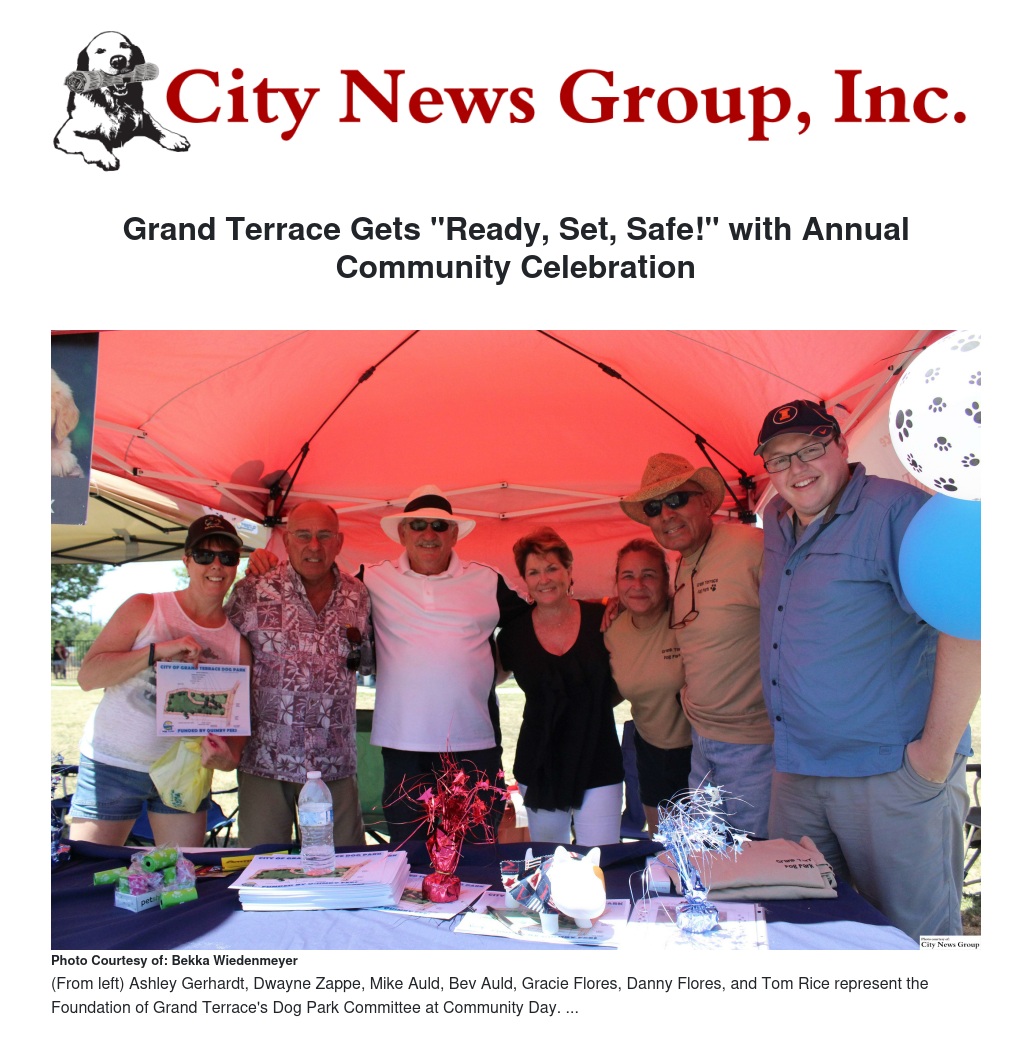 Another organization at Community Day was the Foundation of Grand Terrace's Dog Park Committee, represented by Mike and Bev Auld and President Tom Rice.