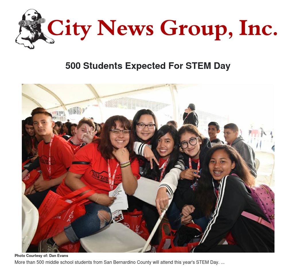 More than 500 middle school students from San Bernardino County will attend this year's STEM Day at Auto Club Speedway in Fontana.