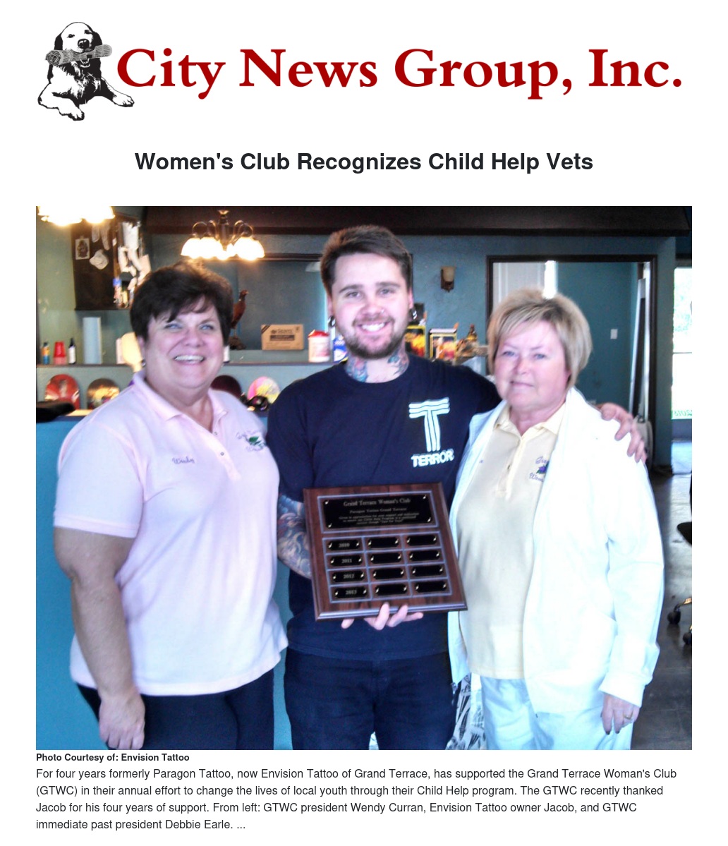 For four years formerly Paragon Tattoo, now Envision Tattoo of Grand Terrace, has supported the Grand Terrace Woman's Club (GTWC) in their annual effort to change the lives of local youth through their Child Help program. The GTWC recently thanked Jacob for his four years of support. From left: GTWC president Wendy Curran, Envision Tattoo owner Jacob, and GTWC immediate past president Debbie Earle.