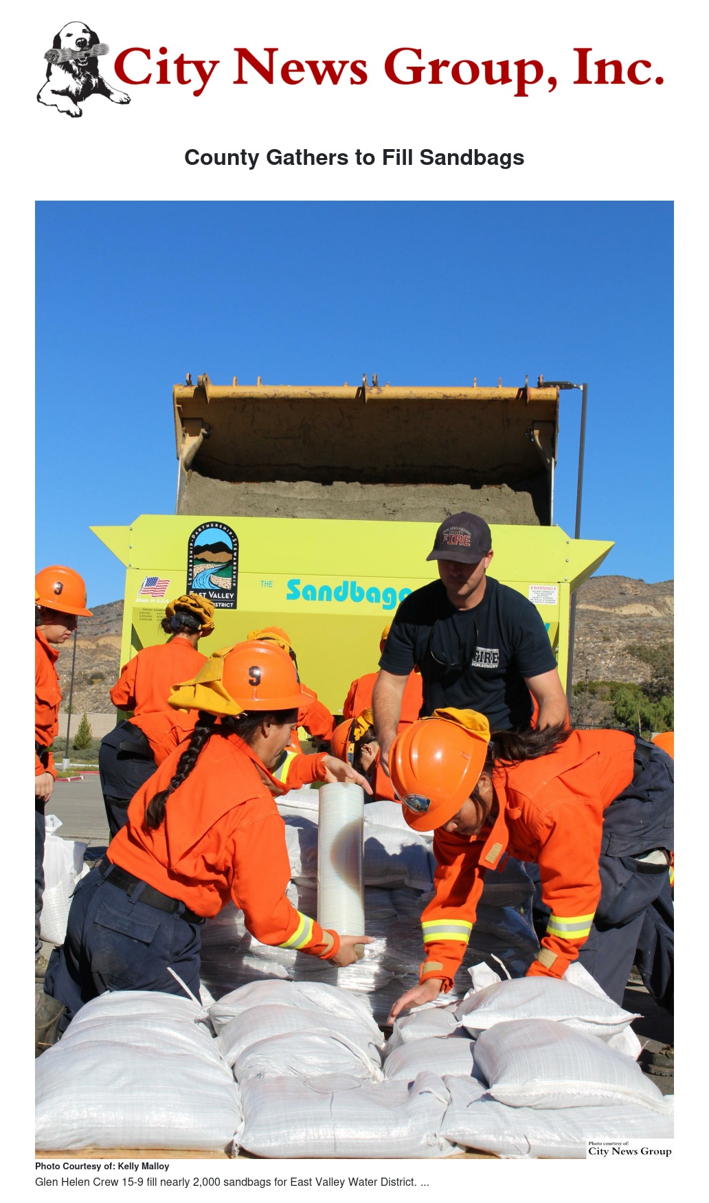 In preparation of heavy rains, East Valley Water District (District) received assistance from the San Bernardino County Fire Department (County Fire) on Thursday, Dec. 17, 2015 to fill sandbags. Through County Fire’s partnership with the San Bernardino County Sheriff’s Department, a 13-member all female inmate fire crew, known as Glen Helen Crew 15-9, worked to fill nearly 2,000 sandbags.