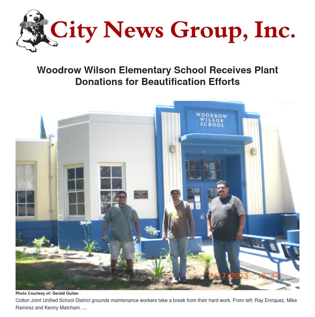 For just under a month, Colton Joint Unified School District (CJUSD) grounds maintenance workers, Wilson Elementary School staff and Serrano Nursery employees worked together to revive the campus just in time for the school to open its grounds for the 75th year this coming August during the 2013–2014 school year.