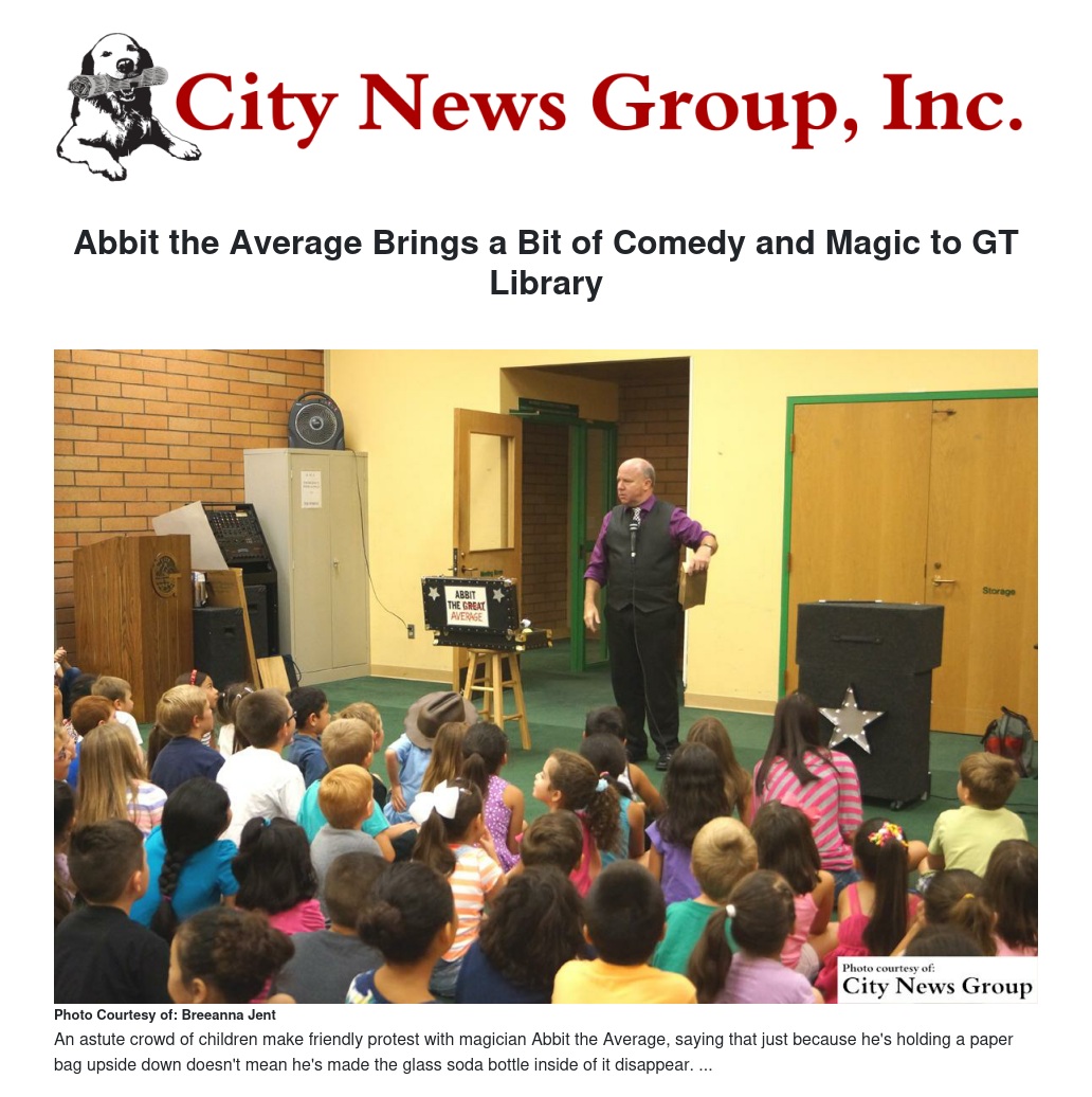Abbit the Average blended comedy and magic into an entertaining show on Thursday morning, July 16, as part of the Grand Terrace Library's Summer Reading Program. His show was one of several events put on by the Friends of the Library group, longtime member Barbara Khacherian told the Grand Terrace City News. The Friends of the Library regularly fundraises through its annual Book Sale at the Country Fair to help bring summer programs - this year, there are a total of seven - to the community. The interactive, free events include an animal presentation, magic shows, juggling shows, and even chemistry and planetarium demonstrations.