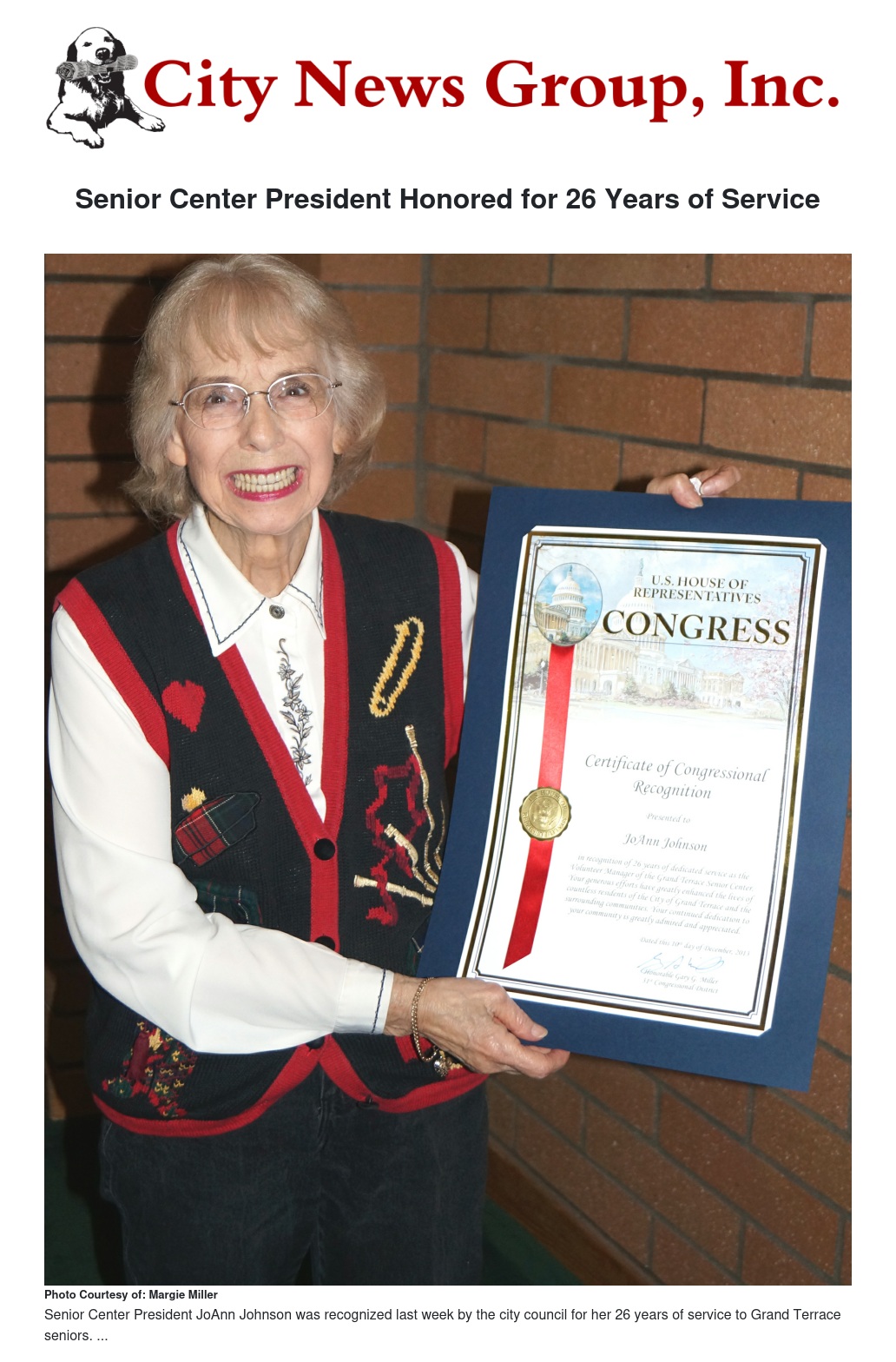 Johnson, who has resided in the bedroom community since 1958, has served in various capacities on the board of the Grand Terrace Senior Center, most recently as its president. At the end of this year, she will retire from her post and her position with the board. Jane Haines will succeed Johnson in the role of Senior Center president.