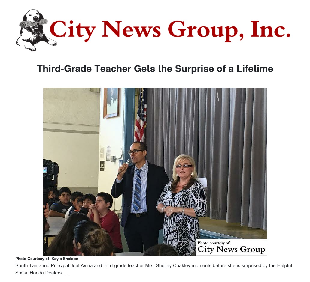 The Helpful SoCal Honda Dealers celebrated Teacher Appreciation Week in the Inland Empire as they made a stop at South Tamarind Elementary School in Fontana to surprise a well-deserving teacher with a myriad of school supplies and a stage makeover worth $5,000 on Tuesday, May 3.