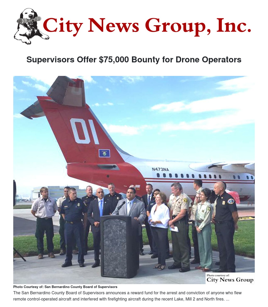 The Board of Supervisors last week announced a $75,000 reward fund for the arrest and conviction of anyone who flew any remote control-operated aircraft and interfered with fire-fighting aircraft during the recent Lake, Mill 2, and North fires.