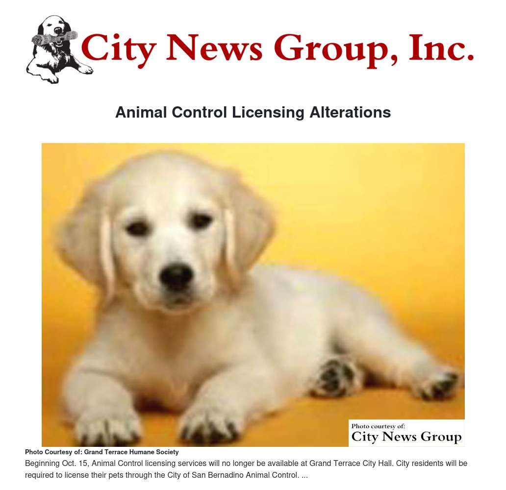 Beginning Oct. 15, Animal Control licensing services will no longer be available at Grand Terrace City Hall. City residents will be required to license their pets through the City of San Bernadino Animal Control, located at 333 Chandler Place, San Bernadino, CA 92408.