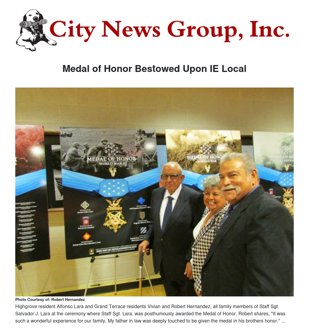 Staff Sgt. Salvador J. Lara, long-time resident of the Inland Empire, has been posthumously awarded a Congressional Medal of Honor from the White House and Flag of Honor from the United States Pentagon. His son, Alfonso Lara, took a five-day all-expenses-paid trip to Washington D.C., along with his daughter Vivian and her husband Robert to accept the Medal and Flag on Salvador’s behalf.