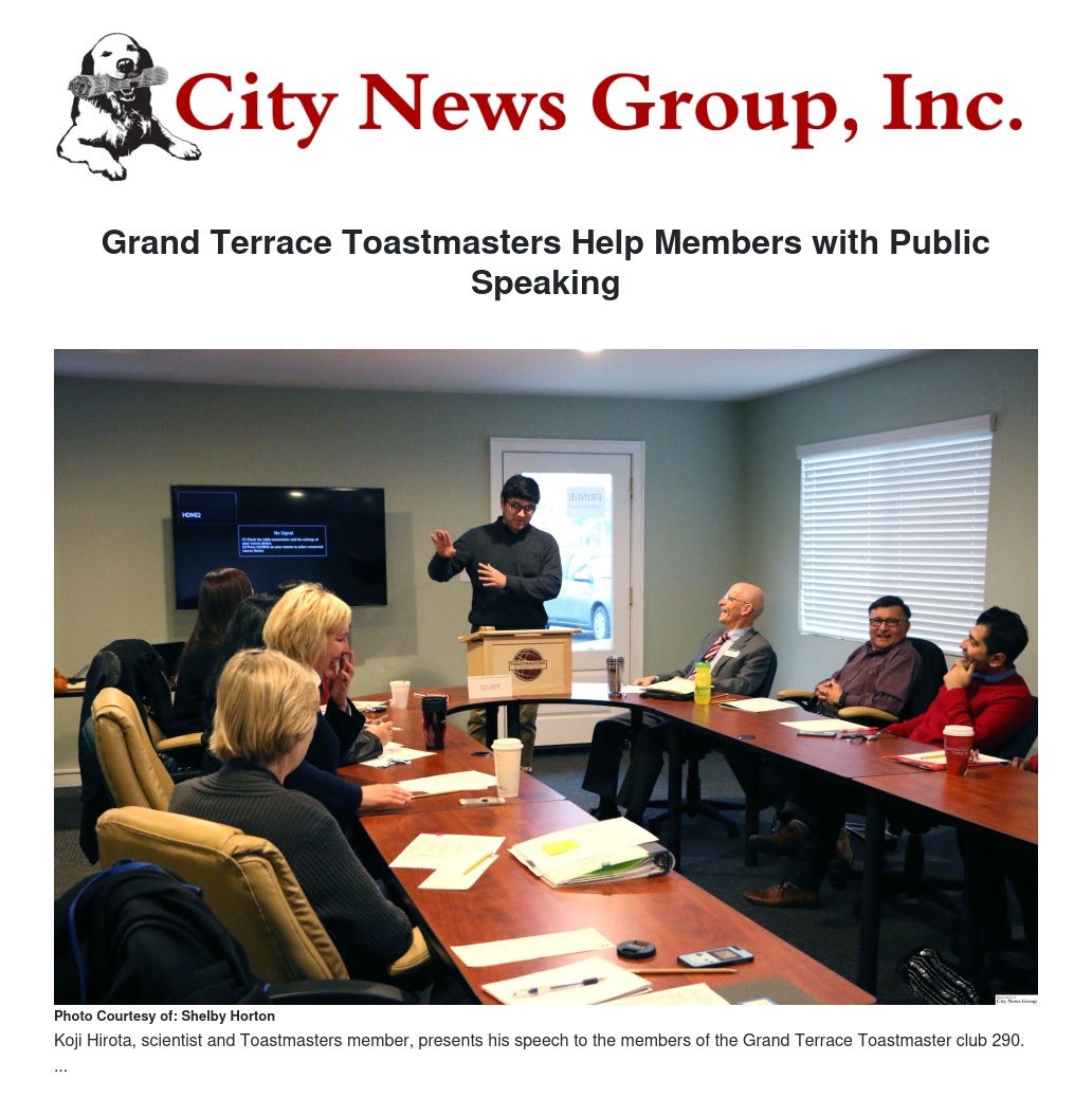 GRAND TERRACE>> Public speaking is known to be feared more than death among some people, according to a Washington Post survey. Public speaking can be involved in everyday life from presenting at a board meeting, socializing at a party and conversations between family members.