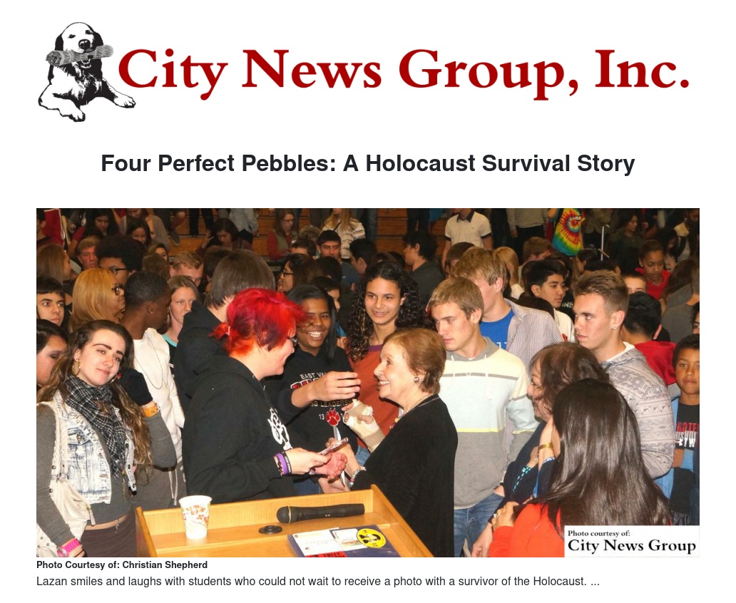 On Thursday, Jan. 22, Redlands East Valley (REV) High School hosted Mrs. Marion Lazan, author of “Four Perfect Pebbles,” a story that highlights her struggle as a Jewish German during WWII, the German invasion of Holland and the concentration camps she was forced to endure through most of her childhood.