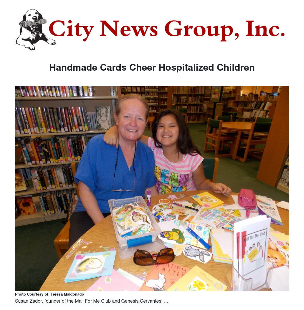 “Kids love to do something for others,” shared Susan Zador, founder of the Mail For Me Club, a group of volunteers of all ages making cards for sick children in the surrounding local hospitals. The group meets in various city libraries through the IE since 2000.