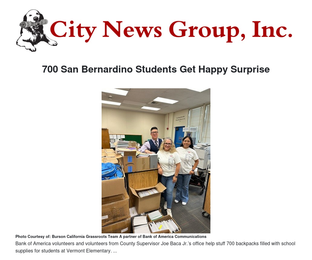 Students at Vermont Elementary School in San Bernardino City Unified School District were greeted with excitement and gratitude this week as they received a generous donation of new backpacks filled with essential school supplies. The initiative, spearheaded by Bank of America in collaboration with San Bernardino County Supervisor Joe Baca Jr. and his office, aimed to support students and ease the burden on families ahead of the new school year.