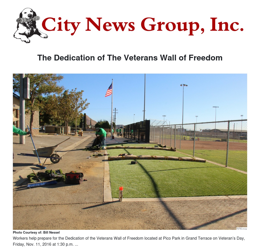GRAND TERRACE>> The time has finally come for the Dedication of the Veterans Wall of Freedom located at Pico Park in Grand Terrace on Veteran’s Day, Friday, Nov. 11, 2016 at 1:30 p.m.