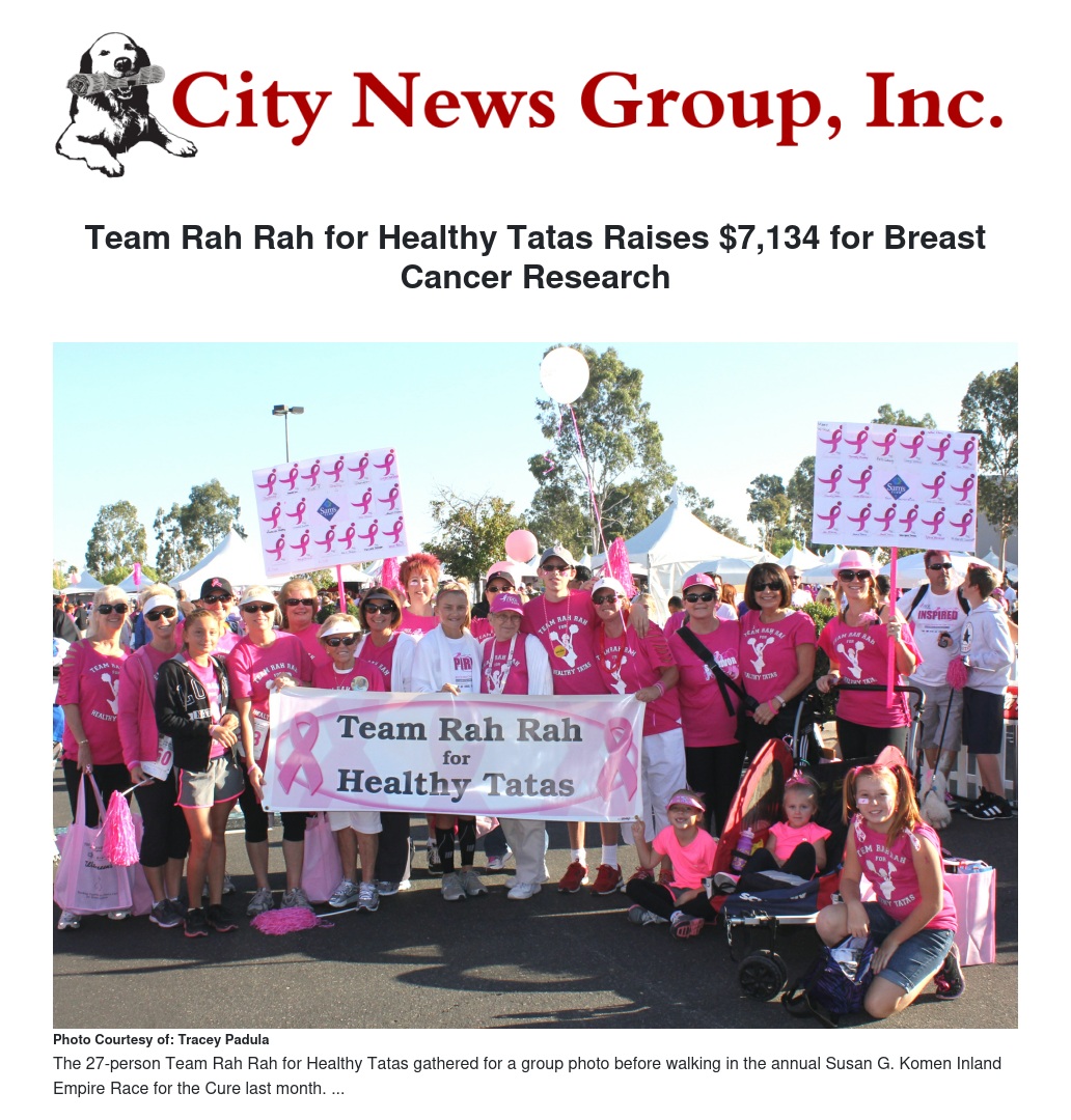 The 15th Annual Susan G. Komen Inland Empire Race for the Cure was held last month in Temecula. Team Rah Rah for Healthy Tatas walked along with 9,400 other participants to show their support and help with the promise to end breast cancer.