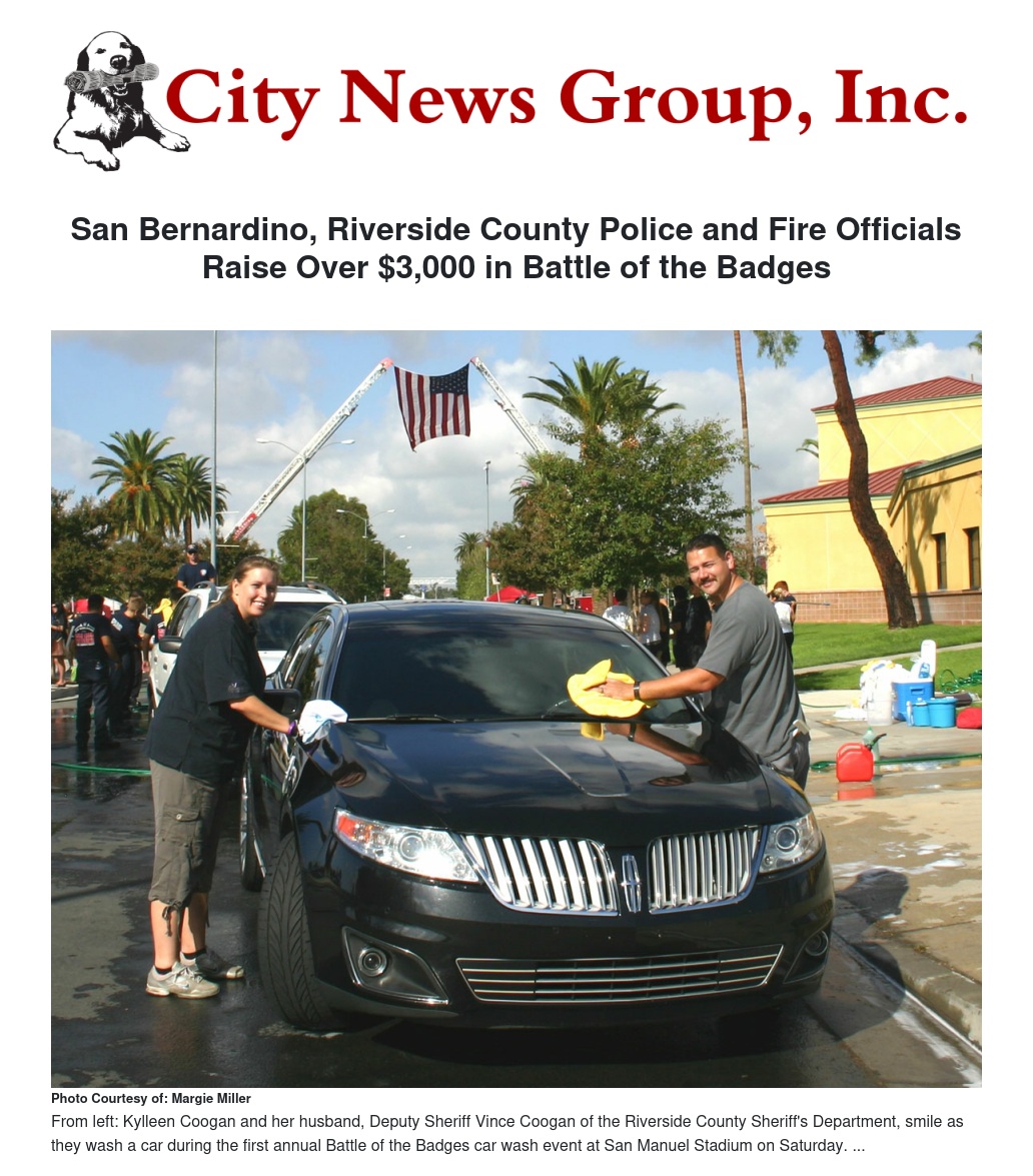 Over $3,000 was raised from this first annual fundraiser event, which saw San Bernardino and Riverside county police, firefighters, paramedics and volunteers from San Bernardino and Riverside county police and fire explorer programs working together with members of the Kiwanis Club of Highland’s Key Club, Boy Scouts Troop 45 of Highland and local high school students to wash the steady stream of vehicles pulling in to the stadium.