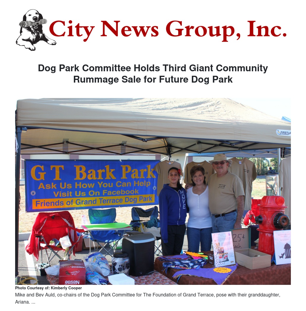 On Saturday morning, Oct. 12, an arc of balloons greeted visitors entering the parking lot at Walgreens on the corner of Barton Road and Mt. Vernon Street in Grand Terrace, where The Foundation of Grand Terrace Dog Park Committee held its third community rummage sale to raise money to build the city’s first dog park.