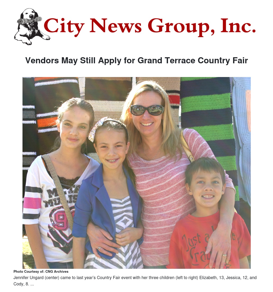 The Grand Terrace Historical and Cultural Activities Committee is still looking for vendors to participate in the annual Grand Terrace Country Fair on Saturday, No. 2, 2013 from 9 a.m. to 3 p.m. at the Lions Grand Terrace Community Center on the corner of Barton Rd. and Vivienda Ave.