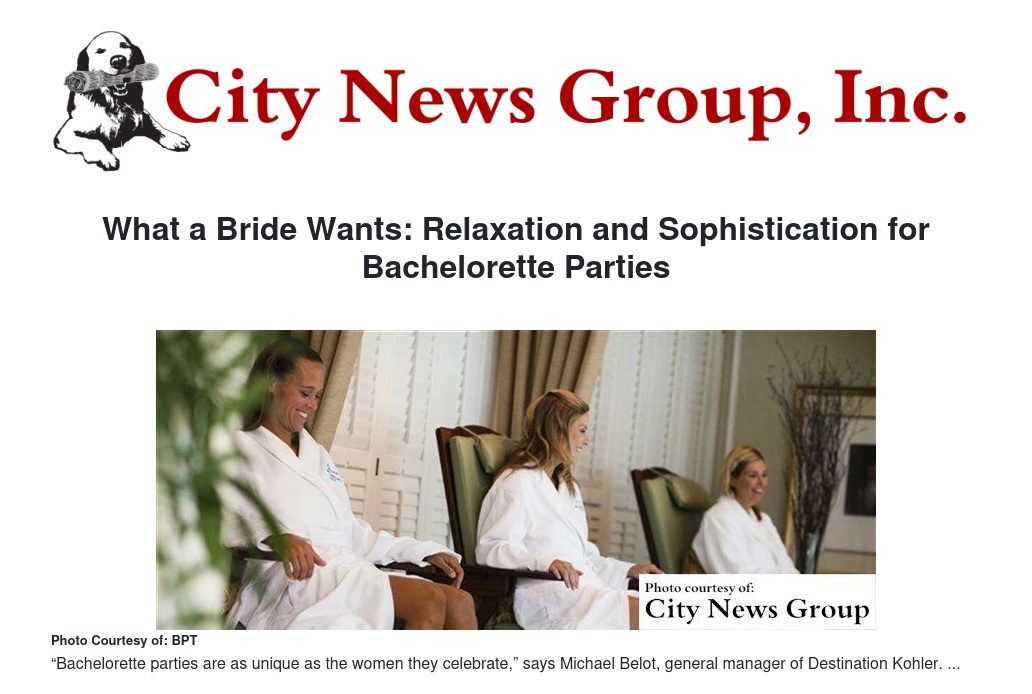 “Bachelorette parties are as unique as the women they celebrate,” says Michael Belot, general manager of Destination Kohler – home to AAA five-diamond and Forbes five-star hotel that hosts scores of brides, bridesmaids and weddings each year. “We’re seeing an emphasis on relaxation for the bride and companionship with her friends in today’s bachelorette parties. Brides want to spend their special night – and often an entire weekend – in a soothing, stress-free atmosphere before the hectic pace of their wedding day.”