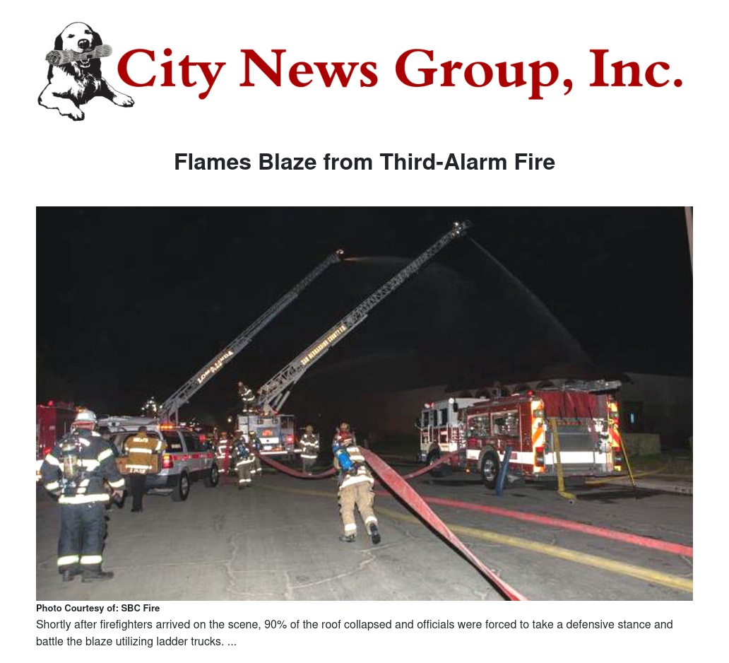 Shortly after fire responders arrived on scene 90 percent of the roof of the building collapsed and firefighters battled the flames with ladder trucks. Though the flames were extinguished an hour later, firefighters remained on scene for several hours for extensive mop-up, fire officials said. A construction yard adjacent to the burning building was saved from flames.