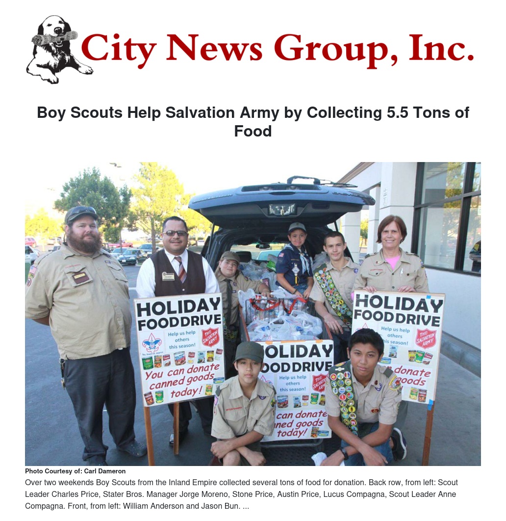 The Boy Scouts of the Inland Empire helped The Salvation Army’s San Bernardino Corps feed hungry people by collecting more than five and a half tons of food over two weekends.