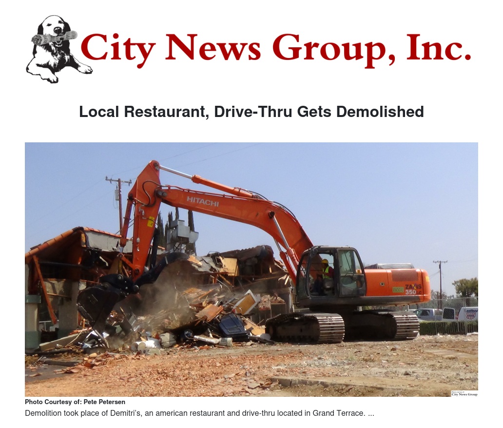 GRAND TERRACE>> Demitri’s, an american restaurant and drive-thru located in Grand Terrace has been demolished to make way for the upcoming I-215/Barton off ramp makeover.