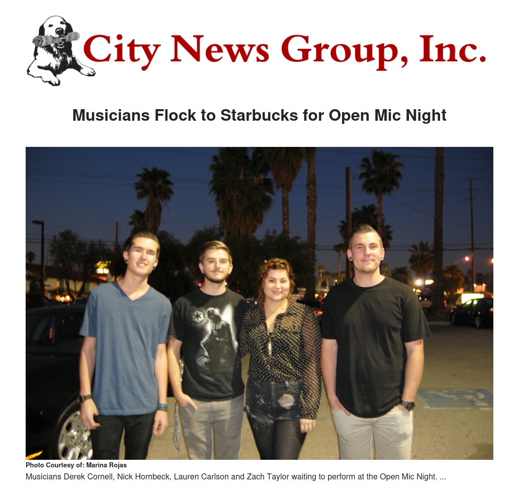 In the crowd a proud grandpa, Chester Easter, had driven all the way from Paso Robles to be part of this night in support of his grandson Derek Cornell. “This is his first Open Mic Night at Starbucks,” said Easter, who took video as Cornell played his set. Cornell was there with his acoustic Indie group called Fall Begins, which included Nick Hornbeck, Zach and Kyle Taylor and Lauren Carlson. Mom Tava Cornell of Yucaipa was taking pictures of the group as their friends and family had come to lend support.