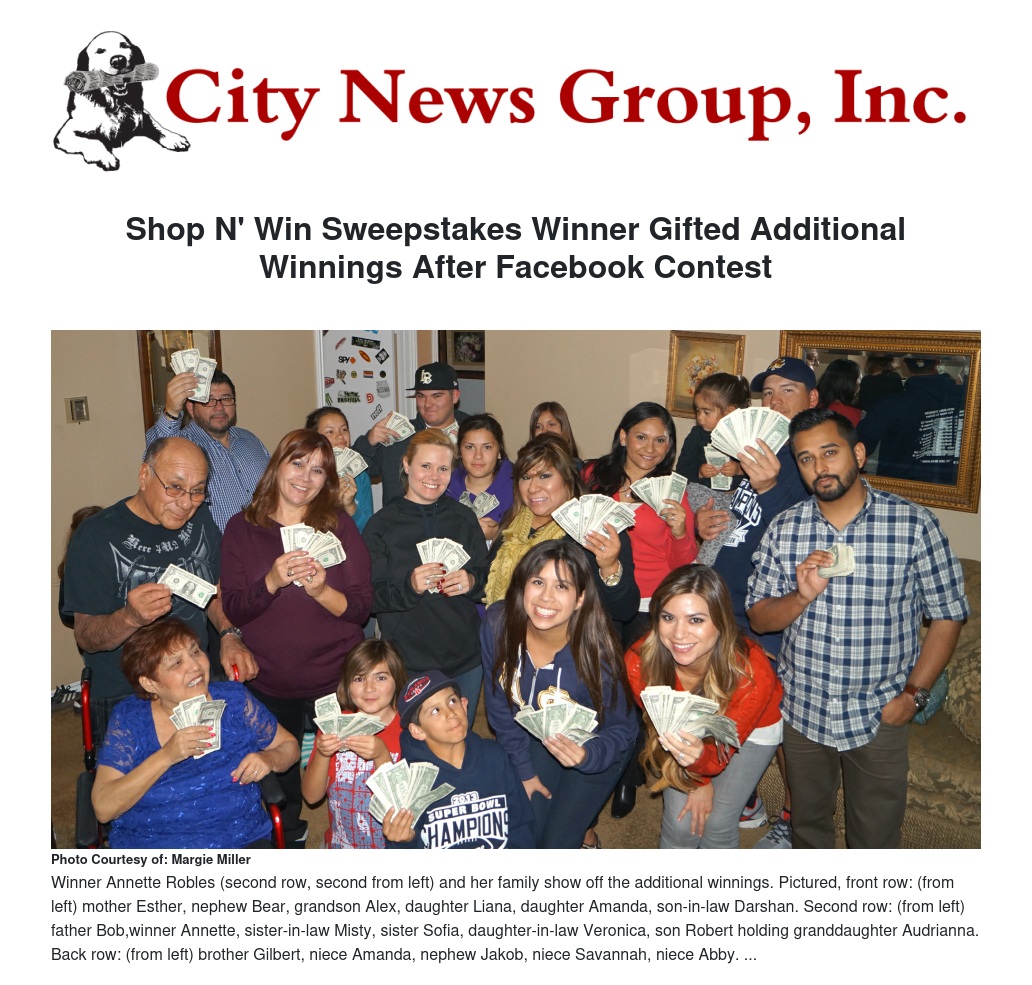 In December 2013, Miller contacted Robles to let her know she had won the November 2013 Shop N' Win monthly coupon sweepstakes after Robles's winning Grand Terrace Market Night coupon was drawn. The grand prize totaled $1,000.