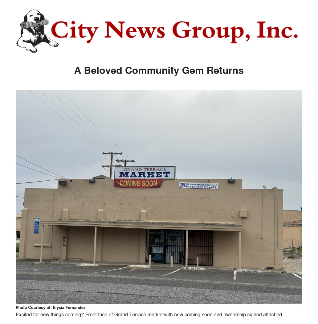 As the new owners prepare for the grand reopening, the community of Grand Terrace looks forward to rediscovering their beloved market where friendships flourish, traditions continue, and local flavors abound. The Grand Terrace Market is not just opening its doors; it is reopening a cherished chapter in the story of our community. Stay tuned for more updates and join in the excitement as we welcome back a historical landmark that has always been, and will continue to be, a place of joy for all.