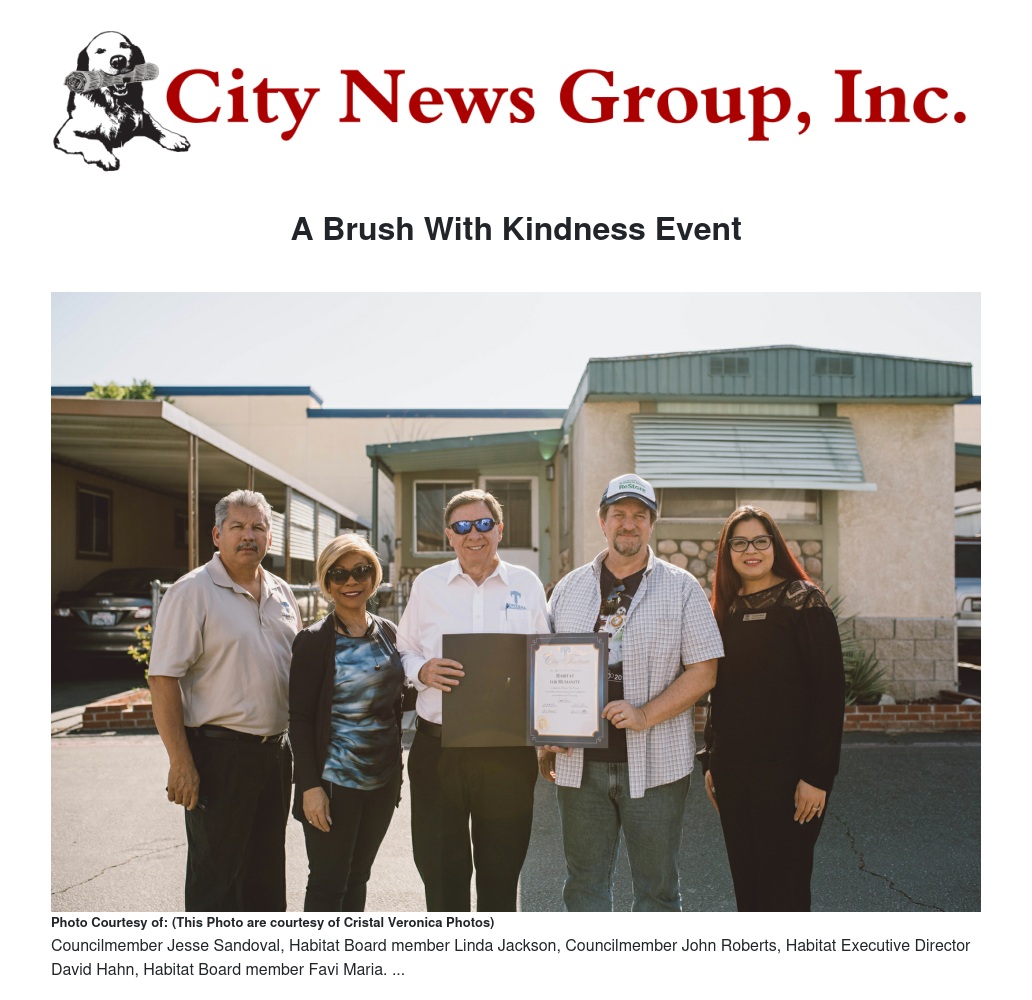 There is an application process to be completed, with eligibility requirements, in order to be considered a candidate for “A Brush With Kindness” events. For example, homeowners must reside in the home as their primary residence, homeowners must have homeowner’s insurance, and total household income must fall below 80% of the of the median household income in San Bernardino County. For more information, go to their website at www.habitatsb.org or call 909-478-1176.