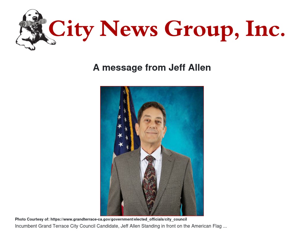 Re-electing me, Jeff Allen to the City Council means keeping a committed advocate for our community at the decision-making table. Please support a proven leader who knows our city well and is ready to see these plans through.