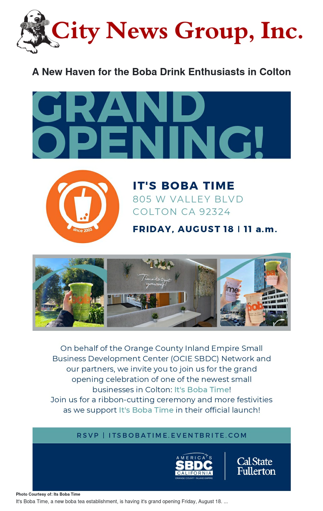 As we prepare for our grand opening, we encourage the Colton community to join us in celebrating the much-anticipated arrival of It's Boba Time. Stay tuned for updates on special promotions, giveaways, and events that we will be hosting to share our love for boba and connect with our valued customers. To learn more, go to www.itsbobatime.com and follow Its Boba Time on Instagram @itsbobatimehq.