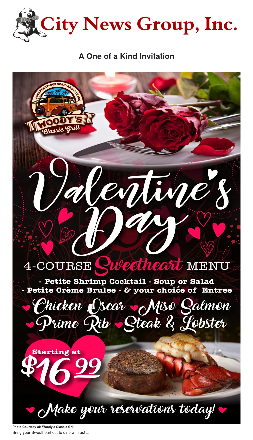 Woody’s Classic Grill, located in the heart of Grand Terrace, is one such restaurant catering to the sweethearts not only on February 14th, but on a daily basis. Mike and Lori Miller, owners of Woody’s would like to invite you to bring your special ones out for a taste of love. Chef Miguel will put his talent on display by serving up a delectable meal especially planned and prepped by him and his talented team of professionals in the kitchen. Food lovers will have their choice of either the classic Woody’s menu or the Valentine’s Day Sweetheart Menu, courteously extended from Thursday, February 14th through Sunday, February 16th.