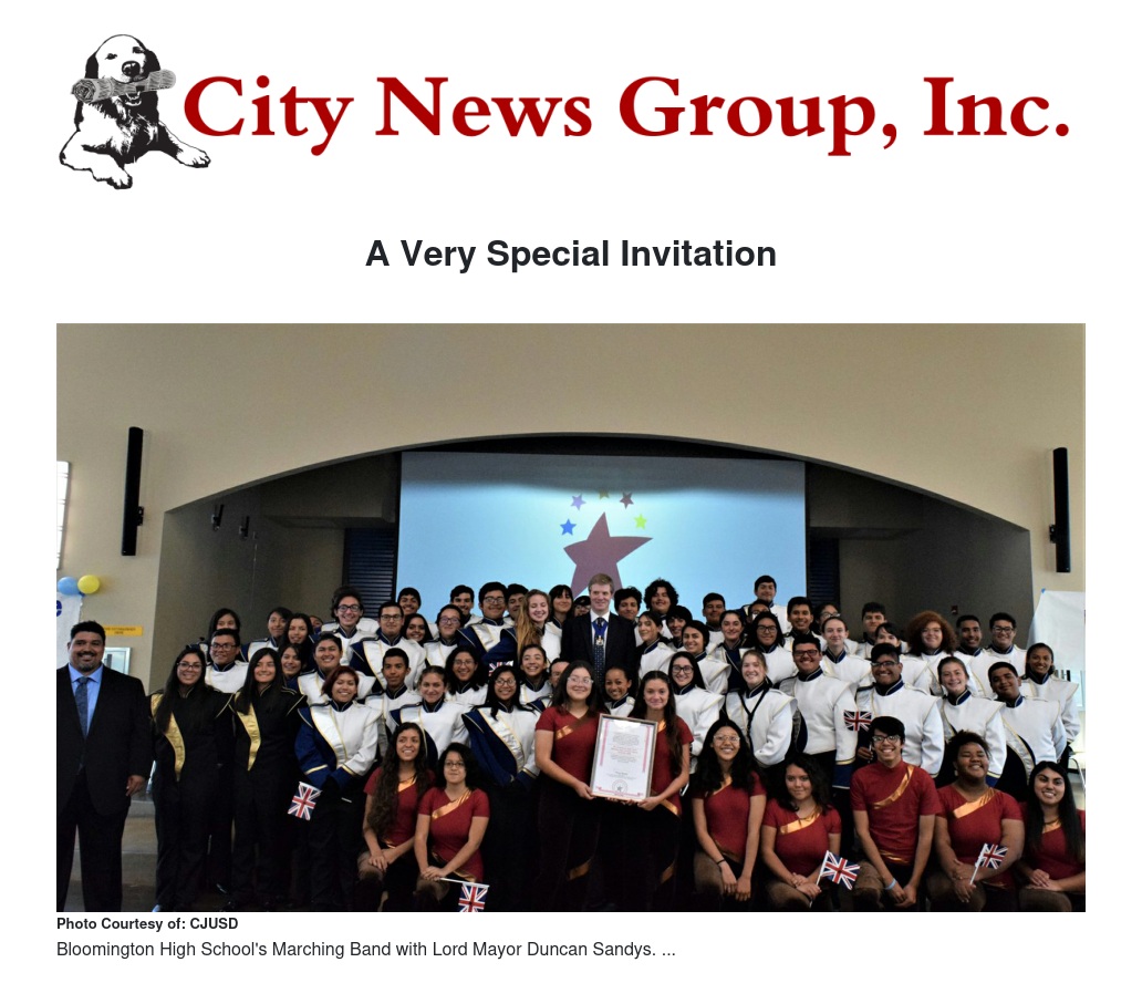 Lord Mayor Duncan Sandys from Westminster (London), England will paid a visit to Bloomington High School on Thursday, Oct. 25 to officially invite the Bloomington High School band to participate in the 2020 London New Year’s Day Parade!