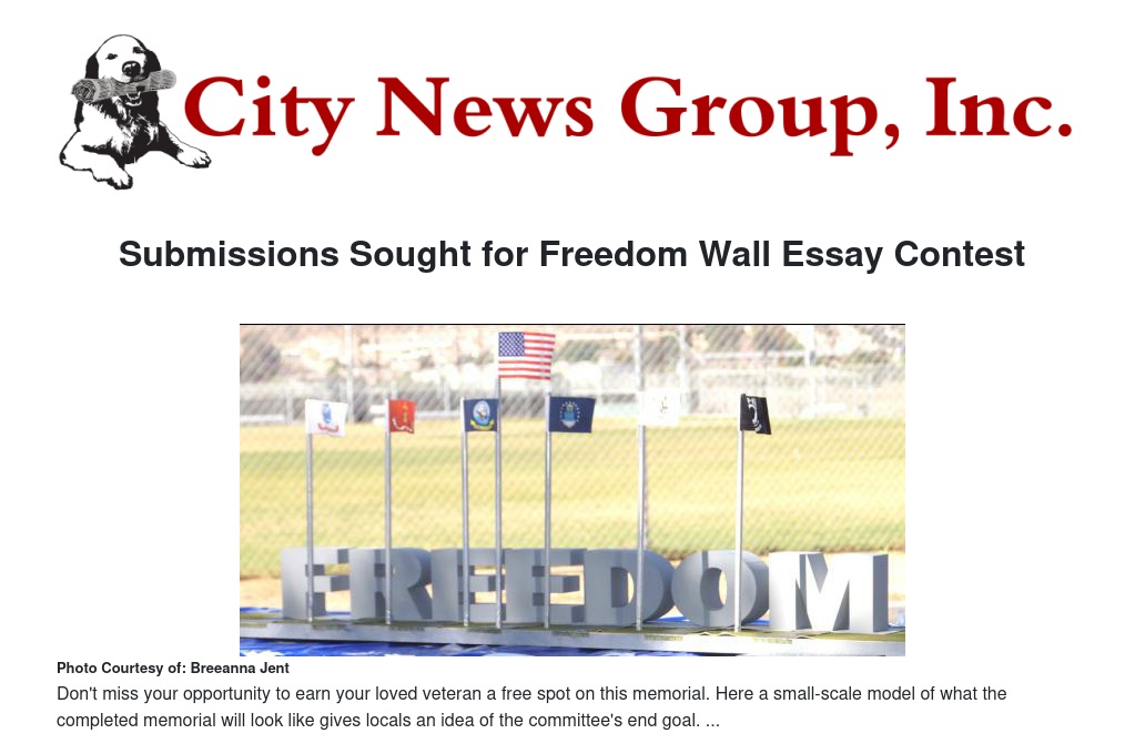 Essay submissions must be one page long, be legible, and explain why they feel that the person they are writing about should receive the sponsored Freedom Wall plaque, courtesy of Jody and Chris Barnett of Barnett Real Estate. Writers of all ages are encouraged to apply.
