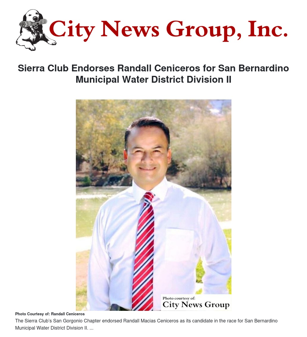 COLTON>> This week, the Sierra Club’s San Gorgonio Chapter endorsed Randall Macias Ceniceros as its candidate in the race for San Bernardino Municipal Water District Division II.