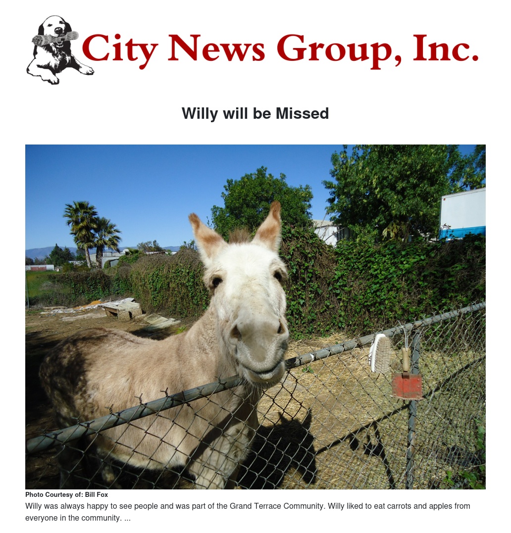 Grand Terrace will never be the same again after losing a close member of the community. On Friday April 11, Willy the donkey passed away.