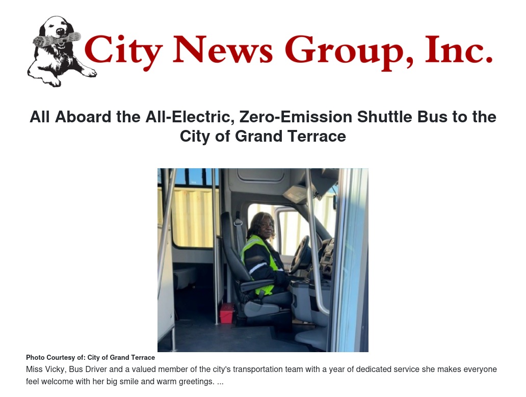 City of Grand Terrace proudly announces the acquisition of a new all-electric bus, made possible through funding from the Volkswagen (VW) Environmental Mitigation Trust. Sourced from Phoenix, this eco-friendly vehicle marks a significant step towards sustainable transportation in our community. Designed to serve the needs of our senior and disabled residents, the bus will facilitate transportation to essential appointments, routine outings such as grocery shopping, and special events. Its emission-free operation aligns with our commitment to environmental stewardship and improving air quality. Operated by Vickie Thompson, a valued member of the city's transportation team with a year of dedicated service, the bus symbolizes our dedication to providing safe, reliable, and environmentally conscious transportation solutions for all members of our community.